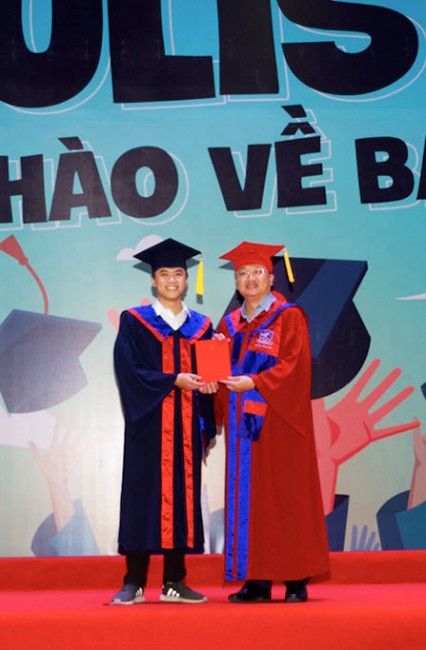 Hiệu trưởng Đỗ Tuấn Minh trao bằng tốt nghiệp cho Thắng