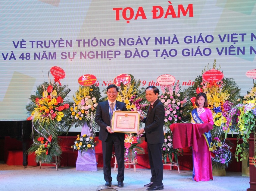 Ông Phạm Tất Thắng - Phó Chủ nhiệm Uỷ ban Văn hóa, Giáo dục, Thanh niên, Thiếu niên và Nhi đồng của Quốc hội trao bằng khen cho PGS.TS. Đào Đăng Phượng - Hiệu trưởng Nhà trường có thành tích xuất sắc trong công tác đào tạo Văn hóa nghệ thuật, Thể dục thể thao và Du lịch giai đoạn 2012-2017