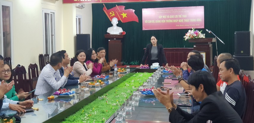 Trong buổi gặp mặt đồng chí Bùi Thị Dung – Bí thư Đảng ủy, Q. Hiệu trưởng trường Cao đẳng Văn hóa Nghệ thuật Thái Bình đã giới thiệu một số nét chính về sự phát triển của Nhà trường trong 45 năm qua. Tại buổi gặp mặt PGS.TS. Đào Đăng Phượng cũng nhấn mạnh rằng chương trình gặp mặt – giao lưu giữa hai trường là dịp rất tốt để cán bộ, giảng viên có điều kiện trao đổi kinh nghiệm trong công tác giảng dạy nghệ thuật, tăng cường mối đoàn kết và hiểu biết nhau, để phát huy tốt hơn vai trò, nhiệm vụ chuyên môn của đơn vị. Với thế mạnh, kinh nghiệm đào tạo giáo viên chuyên ngành nghệ thuật ở trình độ cao trong thời gian tới Trường ĐHSP Nghệ thuật TW sẽ tiếp tục hỗ trợ đào tạo cho cán bộ, giảng viên của trường Cao đẳng Văn hóa Nghệ thuật Thái Bình ở trình độ Tiến sĩ.