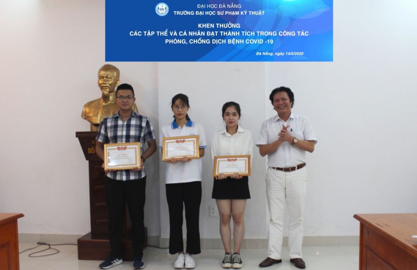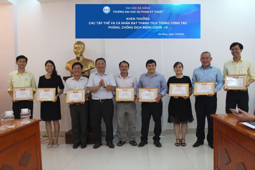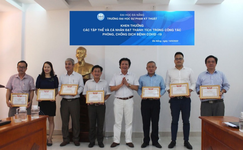 Ban Giám hiệu Nhà trường đã trao tặng Giấy khen và tiền thưởng cho 07 tập thể gồm: Tổ bảo vệ-Phòng Tổ chức Hành chính, Trung tâm Học liệu và Truyền thông, Khoa Cơ khí, Khoa Công nghệ Hóa học-Môi trường, Khoa Điện-Điện tử, Đoàn Thanh niên, Nhóm Nghiên cứu Robot khử khuẩn và 09 cán bộ viên chức, 03 sinh viên vì đã có đóng góp tích cực trong công tác phòng, chống dịch Covid-19.