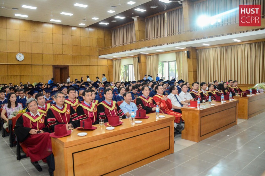 Chúc mừng và trao bằng cho các tân tiến sĩ, PGS Hoàng Minh Sơn phát biểu, bày tỏ niềm vui mừng và tự hào bởi Trường ĐHBK Hà Nội đã đạt được nhiều thành tích cao trong nghiên cứu khoa học và đào tạo sau đại học. Đào tạo sau đại học góp phần cung cấp nguồn cán bộ chất lượng cao cho các trường đại học, cao đẳng, viện nghiên cứu. Hiệu trưởng vui mừng cho biết: “Trong những năm gần đây, tỷ lệ bảo vệ thành công luận án tiến sĩ đã tăng từ 50% đến 67%. Đặc biệt, một trong những yêu cầu khắt khe của quy chế đào tạo tiến sĩ hiện nay là các bài báo, công bố và Trường ĐHBK Hà Nội luôn đạt được chất lượng cao hơn hẳn so với yêu cầu đặt ra; cụ thể, trung bình có 5,8 bài/NCS so với quy chế là 2 bài/NCS, trong đó có 40% là các công bố quốc tế có chỉ số ISI. Đây là thành tích đáng tự hào của Trường ĐHBK Hà Nội”. Đồng thời, PGS Hoàng Minh Sơn đã gửi lời cảm ơn sâu sắc đến các thầy cô giáo hướng dẫn, sự nỗ lực của các tân tiến sĩ và gia đình.