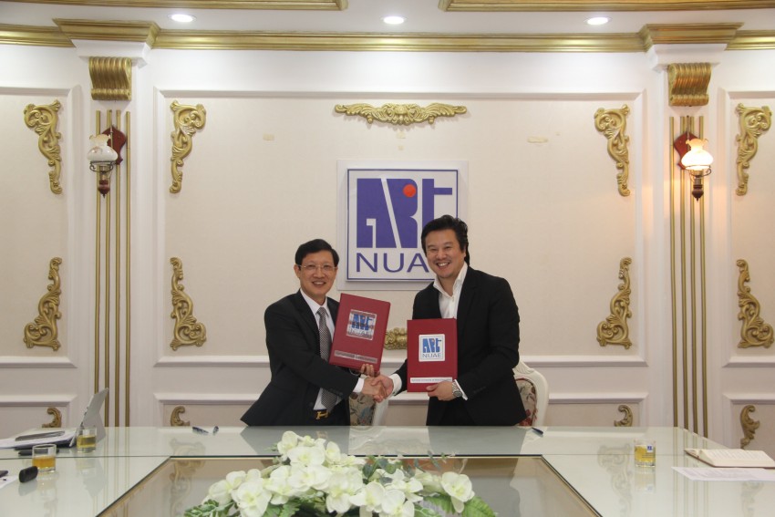 PGS.TS. Đào Đăng Phượng - Bí thư Đảng ủy, Hiệu trưởng Nhà trường và ông Bùi Vu Thanh - Nhà sáng lập AMPA Education trao văn bản hợp tác