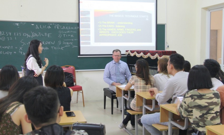 Kết thúc buổi làm việc với Ban Giám hiệu nhà trường, TS Scott Holden đã có một số bài giảng chuyên ngành cho sinh viên khoa Piano về một số phương pháp phát triển, kỹ thuật piano, sư phạm piano như kỹ thuật chơi một bài piano, cấu tạo của một bản Sonata, phương pháp luyện tập piano một cách hiệu quả… Đặc biệt trong chiều ngày 09/5/2019 TS. Scott Holden đã biểu diễn một số tác phẩm piano nổi tiếng trên thế giới tại phòng hòa nhạc. Đây thực sự là cơ hội trau dồi và trao đổi học thuật quý báu cho giảng viên, sinh viên, học viên nhà trường đặc biệt trong bối cảnh hợp tác và công bố quốc tế hiện nay đang được xã hội quan tâm, với đòi hỏi nâng cao chất lượng và hội nhập quốc tế.