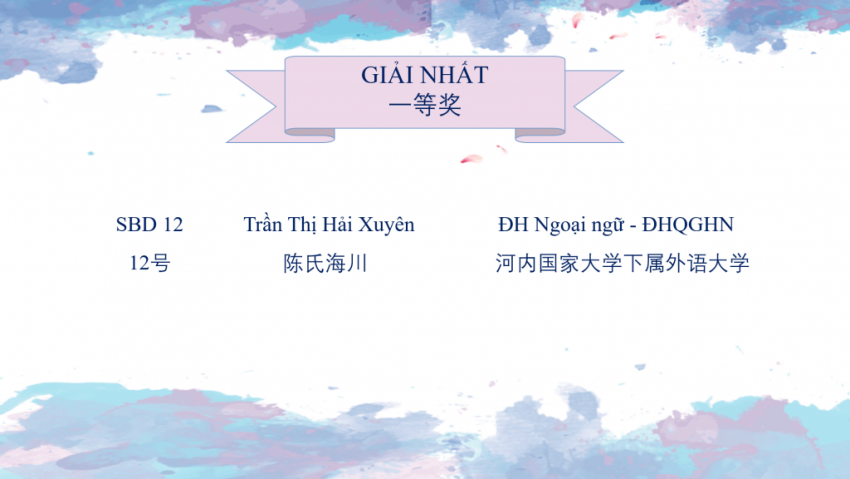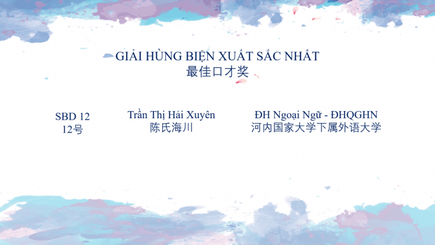 Hải Xuyên: Xin chào các thầy cô và các bạn. Em là Trần Thị Hải Xuyên, sinh viên năm 3 khoá QH2018 CLCTT23 Khoa Ngôn ngữ và Văn hoá Trung Quốc.