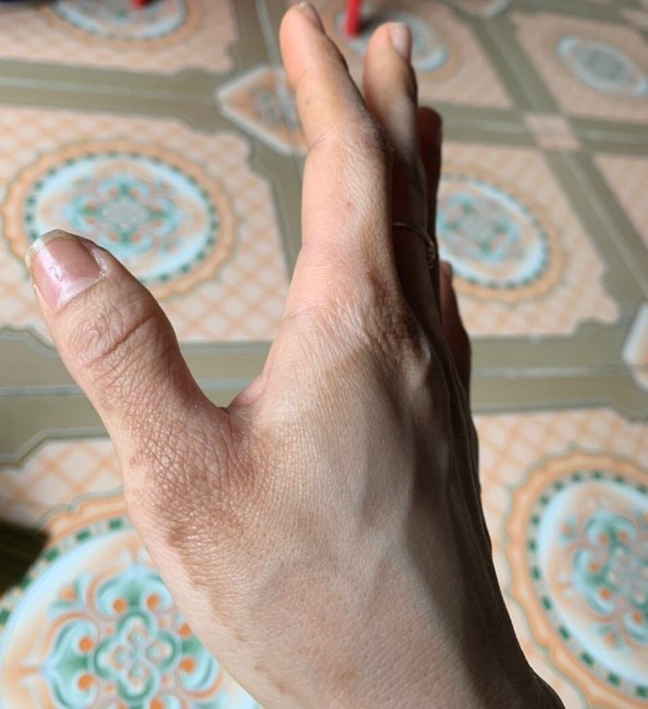 - Tại chỗ tiếp xúc: Mụn nước, ban đỏ, ngứa quanh móng và vùng tiếp xúc ở bàn tay, sau đó là thâm da.