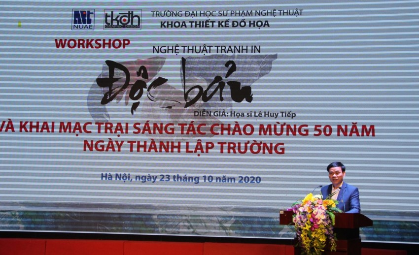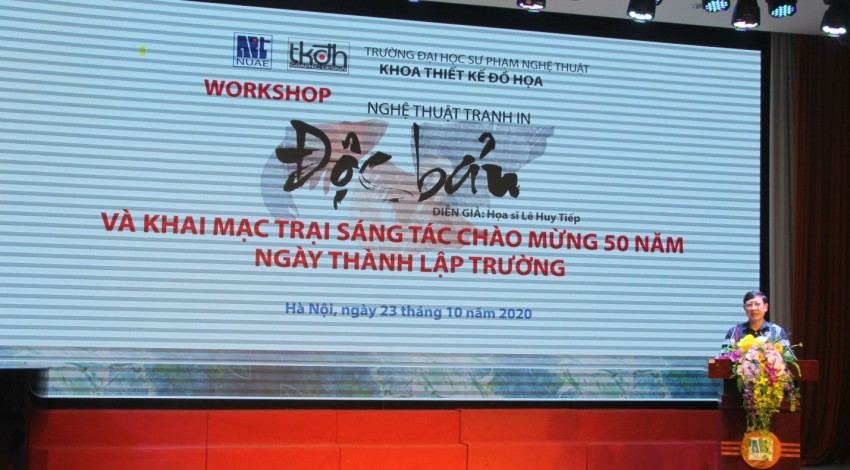 Workshop Nghệ thuật Tranh in độc bản với sự hướng dẫn của Họa sỹ Lê Huy Tiếp giúp các bạn sinh viên ngành đồ họa có cơ hội khám phá muôn vàn khả năng khai thác và xử lý chất liệu của in độc bản, để từ đó tạo ra những bức tranh độc đáo và ấn tượng theo cách của riêng mình. Họa sỹ giới thiệu các bức tranh in độc bản của ông như: Gặp gỡ, Đông về, Một mảnh lưới,… cũng như cách thức, ý tưởng ông gửi gắm vào những tác phẩm độc đáo đó.