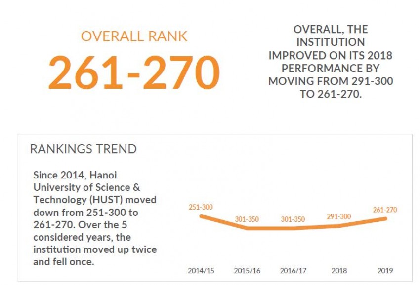 Trường ĐHBK Hà Nội xếp ở vị trí 261-270, vươn lên 30 bậc so với năm 2018, dẫn đầu các trường ĐH trực thuộc Bộ GD&ĐT cũng như các Bộ, Ngành và các trường đại học đang triển khai thí điểm tự chủ toàn diện tại Việt Nam.